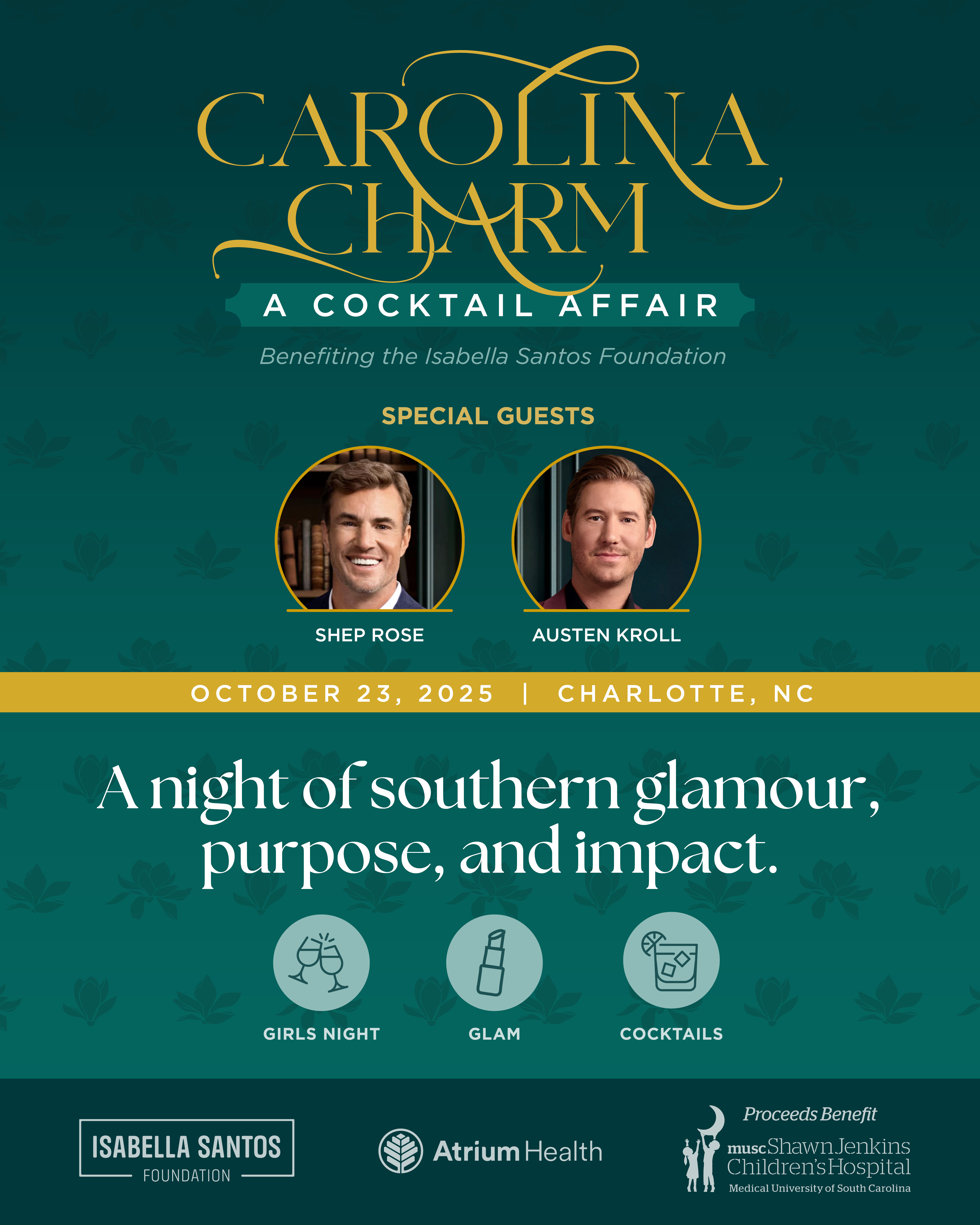 “Carolina Charm is where Southern glam meets meaningful impact,” said Erin Santos, executive director of the Isabella Santos Foundation. “With Shep and Austen bringing the charm and hundreds of stylish, generous women turning out to support the cause, it’s going to be a night to remember. Behind the sparkle is a powerful mission: to give young cancer survivors the chance to dream about their future families.”